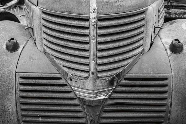 Noir et blanc gros plan d'une calandre de voiture classique et usée avec une symétrie frappante et des lamelles horizontales rouillées. L'image dégage une nostalgie industrielle et une puissance mécanique, renforcées par le contraste entre les textures métalliques et l'usure.