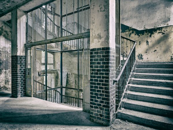 Ancien escalier et cage d'ascenseur en différents matériaux