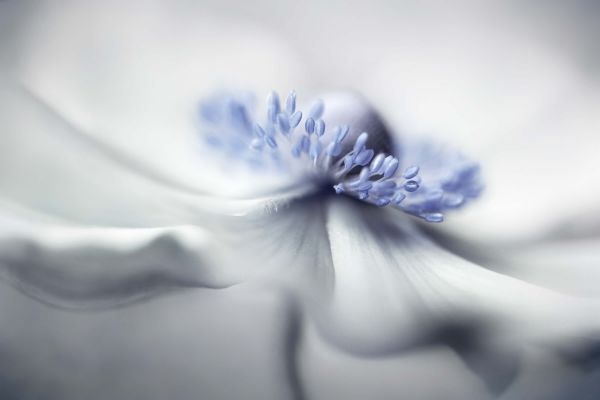 Anemone Spirit est un gros plan d'une fleur d'anémone. L'intérieur bleu de la fleur ressort d'autant plus que le reste de la photo est en noir et blanc.