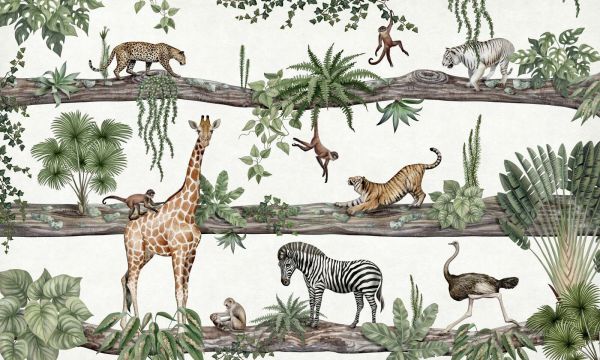 Le style est raffiné et illustratif, avec une grande attention portée à l'expression des animaux et aux textures des plantes. La palette de couleurs se compose principalement de tons naturels tels que le vert olive, le vert mousse, le beige, le brun et des accents subtils d'ocre et de gris-blanc - ce qui rend le design à la fois apaisant et dynamique.