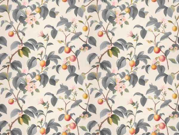 Des branches fines avec des fruits ronds dans des tons chauds de rouge et de jaune sont associées à de douces fleurs roses et à des feuilles élégantes gris bleu. Le fond clair et le motif répétitif donnent à l'ensemble une allure calme, classique et raffinée. longue description du produit : Ce motif délicat présente un arbre fruitier décoratif avec des branches élancées, des fruits mûrs et des fleurs délicates. Les fruits dans des teintes jaune doré, abricot et rose pâle forment un contraste chaleureux avec les feuilles gris bleu froides. De petites fleurs roses apportent une nuance fraîche et romantique. Le fond couleur crème maintient l'ensemble léger et équilibré, tandis que le motif répétitif crée un caractère harmonieux et intemporel. Dans un intérieur classique ou rural, ce dessin apporte une tranquillité raffinée. Associez-le à des meubles en bois en noix ou en chêne, des tissus beiges ou gris clair et des accessoires en céramique ou en verre. La combinaison de fruits chauds et de feuilles fraîches crée un subtil jeu de tension qui rend l'espace vivant mais serein. Également dans un intérieur moderne, ce motif peut fonctionner magnifiquement comme un accent doux. Pensez à des meubles épurés en blanc ou gris clair, associés à des accents noirs pour un contraste supplémentaire. Idéal pour une cuisine, une salle à manger ou un hall où une ambiance légère et botanique est souhaitée avec une allure élégante et contemporaine.