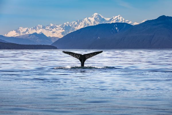 Une baleine plongeante avec des montagnes enneigées à l'arrière-plan