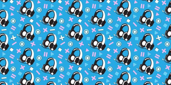 Un design de jeu ludique et moderne avec des motifs répétitifs de casques de jeu et des symboles géométriques sur un fond bleu vif. La combinaison de casques noir et blanc avec des icônes de jeu roses et blanches donne au design une allure rétro et dynamique, parfaite pour une salle de jeu tendance.