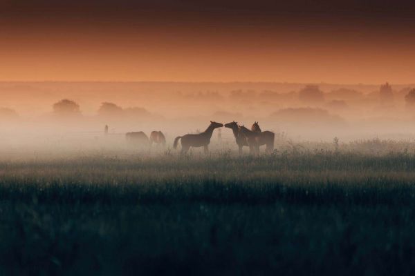 Un groupe de chevaux se tient paisiblement dans un pré brumeux, baignant dans une douce lumière orange matinale. Le ciel et la brume se fondent ensemble pour créer un paysage atmosphérique plein de calme et de rêverie.