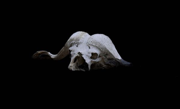 Cette composition impressionnante met en scène un crâne de buffle patiné aux cornes élégamment recourbées, mis en valeur de manière nette sur un fond noir profond. La structure claire et poreuse de l’os contraste intensément avec l’obscurité, rendant visibles chaque détail d’usure et de texture. L’image dégage calme, force et une touche de mystère.