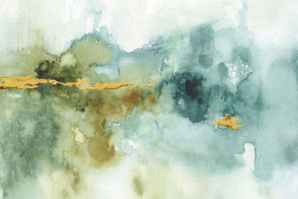 Une composition aquarelle rêveuse dans des tons de vert et de bleu, traversée par une ligne dorée gracieuse. Le design dégage une sensation de calme et présente un mouvement organique et naturel.