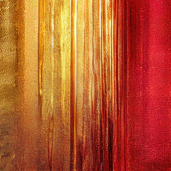 Ce design ardent et luxueux capture la sensation de la lumière tombante dans une composition abstraite de bandes verticales. Les bandes varient en intensité et en texture : du doré scintillant et du cuivre chaud au rouge carmin profond. Les reflets de lumière et les fines structures granuleuses créent un effet étincelant, presque soyeux. Dans son ensemble, il est riche et accueillant, comme si vous regardiez la lumière du soleil traversant des tissus brillants ou des rideaux métalliques.