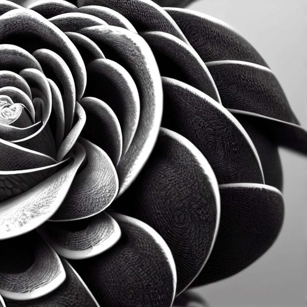 Une rose stylisée se déploie en couches concentriques de noir profond et de blanc argenté. Les lignes épurées et la texture raffinée créent un effet moderne et graphique avec une allure mystérieuse, presque hypnotique.