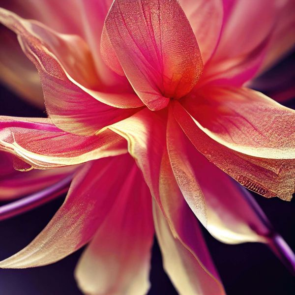 Une fleur dramatique dans des tons de rose vif, orange et or semble s'embraser de l'intérieur. La texture douce et les lignes fluides créent une image chaleureuse, luxueuse et intense.