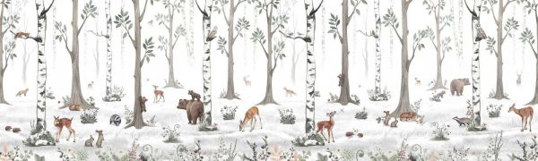 Cette charmante illustration forestière fait vivre le calme et la magie d'une forêt de bouleaux. Entre les troncs élancés de bouleaux, des cerfs, des ours, des renards, des écureuils, des blaireaux, des hiboux et des petits lapins évoluent dans un cadre naturel paisible. Le sol est léger et blanchâtre, ce qui lui donne un aspect frais et presque féérique. Les couleurs sont douces et naturelles : beaucoup de gris-vert, de brun, de beige et des accents de vert mousse et de rose pâle dans les petites fleurs sur le sol de la forêt. Le design s’accorde magnifiquement avec un style d’intérieur scandinave ou rustique, où les éléments naturels et un sentiment de sérénité sont au cœur. Dans une chambre d'enfant, cette scène crée une ambiance fantasque et chaleureuse propice au jeu ou au calme. Associez-le à des meubles en bois, des couvertures en laine et des accessoires dans des tons terre pour une allure harmonieuse. Également dans un coin jeu, un coin lecture ou même un hall, ce motif peut éveiller un sentiment d’émerveillement et de connexion à la nature. Pensez à des combinaisons avec des chaises en rotin, des étagères murales avec de petites figurines en bois ou des décorations inspirées de la forêt comme des champignons ou des feuilles. Le style du motif est riche mais aérien, avec beaucoup d’espace entre les arbres et les animaux. Cela rend le design visuellement accessible et adapté aussi bien aux grands qu’aux petits espaces. La palette de couleurs neutre confère une allure intemporelle qui ne se lasse pas rapidement. Ce paysage forestier chaleureux invite à repartir à la découverte encore et encore.
