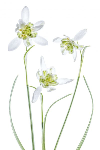 Trois fleurs blanches sur un fond blanc. Galanthus Flore Pleno a été créé par Mandy Disher.