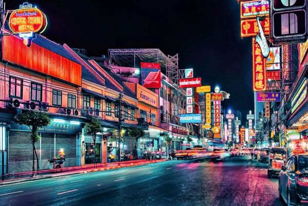 La vie nocturne dans le Chinatown néon.