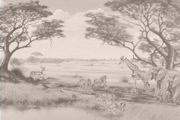 Une impression pittoresque de la savane africaine, où la palette de couleurs douces de tons marron et beige respire le calme de la nature. La convergence harmonieuse des éléphants, des girafes et des zèbres reflète une coexistence pacifique, tandis que le vaste horizon souligne l’immensité du paysage.