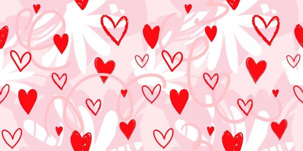 Un motif gai rempli de cœurs rouges et roses, de lignes espiègles et de formes florales douces sur un fond rose. Les couleurs vives et le style aérien créent une atmosphère romantique et joyeuse.