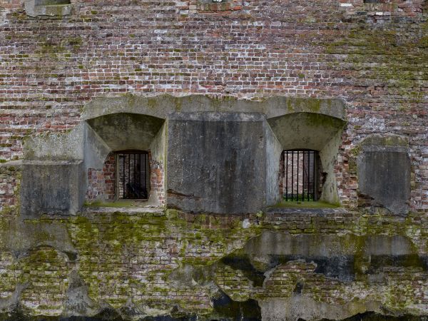 Mur de vieilles briques usées avec 2 niches. La mousse commence déjà à pousser sur l'ancien mur.