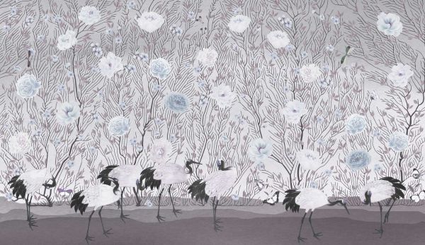 Une scène gracieuse avec des grues majestueuses entourées de roses et de fleurs délicates. Les nuances subtiles de rose et de vert créent une atmosphère sereine et raffinée, rehaussée par les détails gracieux des fleurs et des feuilles. Les papillons et les libellules ajoutent une touche d'élégance au design.