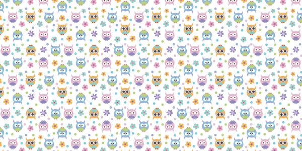 Papier peint avec un motif de hiboux mignons, de fleurs et de points de différentes couleurs pastel.