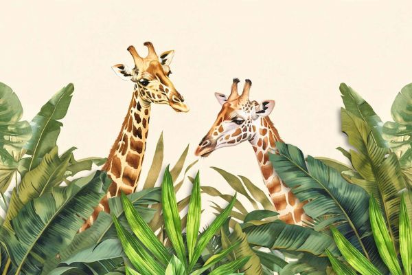 Une élégante et chaleureuse illustration murale de deux girafes dans des teintes aquarelle douces. Les couleurs naturelles et les accents de feuilles subtils donnent une allure apaisante et élégante avec une touche de charme safari.