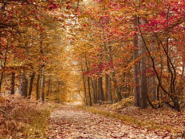 Les riches couleurs de l'automne forment un magnifique tapis le long de cette allée forestière. La palette chaude des feuilles qui tombent et la lumière douce créent une atmosphère apaisante et introspective, parfaite pour une promenade en automne.