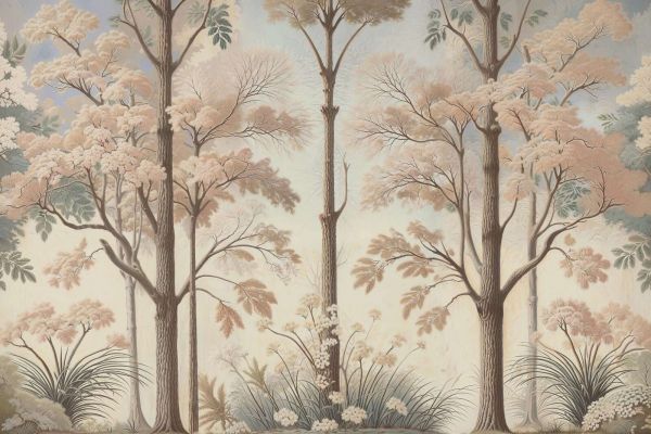 Cette image présente un paysage forestier serein où se dressent au centre de hautes et minces arbres, entourés de douces floraisons, de fines feuilles et d'une sous-vegetation élégante. Les arbres sont élégamment travaillés avec des structures d'écorce subtiles et des cimes aérées, donnant au paysage une impression ouvert et lumineux. La palette de couleurs se compose de tons crème, sable et beige chauds, complétés par un vert grisé et une pointe de bleu pastel en arrière-plan, ce qui ensemble crée une apparence harmonieuse et calme.