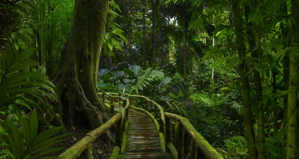 Pont couvert de mousse au milieu de la jungle. Le pont longe des arbres hauts et des buissons envahissants.