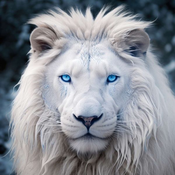 Cette image envoûtante d'un lion blanc aux yeux bleus pénétrants dégage une beauté mystique.