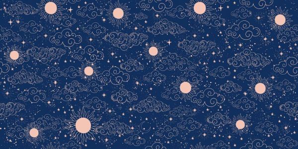 Un motif magique de nuages gracieux, d'étoiles et de soleils sur un ciel bleu profond — parfait pour des créations mystiques ou apaisantes.