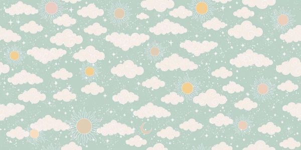 Un motif céleste ludique avec de doux nuages, des soleils, des petites lunes et des étoiles scintillantes en tons pastel sur un fond vert menthe. Le design dégage calme, convivialité et imagination.
