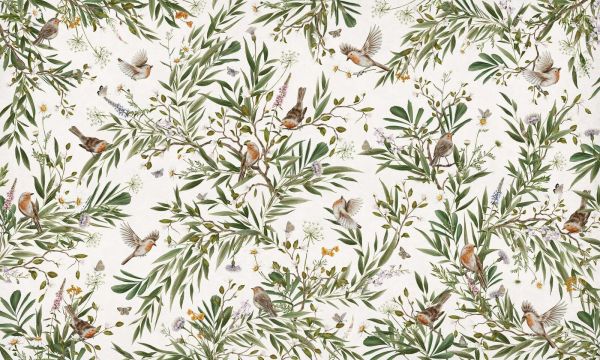 Papier peint panoramique - Rouges-gorges ludiques - Blanc