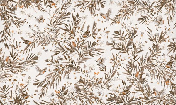 Papier peint panoramique - Rouges-gorges ludiques - Vintage - Blanc