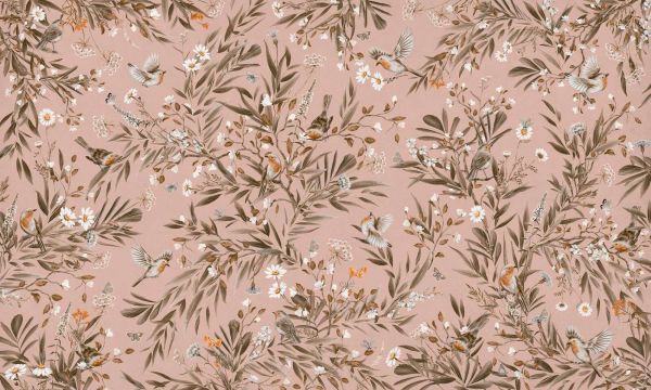 Papier peint panoramique - Rouges-gorges ludiques - Vintage - Rose