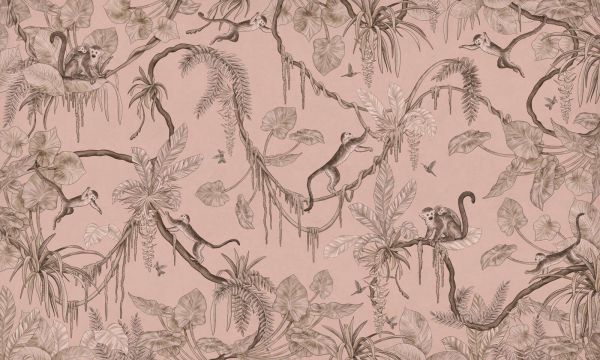 Papier peint panoramique - Singes ludiques - Monochrome - Rose
