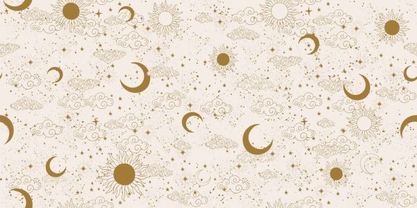Une scène céleste légère de soleils gracieux, de croissants de lune, d'étoiles et de nuages ondoyants en or sur un fond crème doux. L'ensemble dégage sérénité, magie et élégance raffinée.