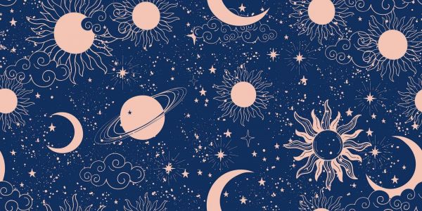 Un ciel rêveur rempli de soleils gracieux, de demi-lunes, de nébuleuses et d'une planète aux anneaux sur un fond bleu profond. La combinaison de douces teintes pêche et d'éléments astronomiques crée une sensation magique et mystique.