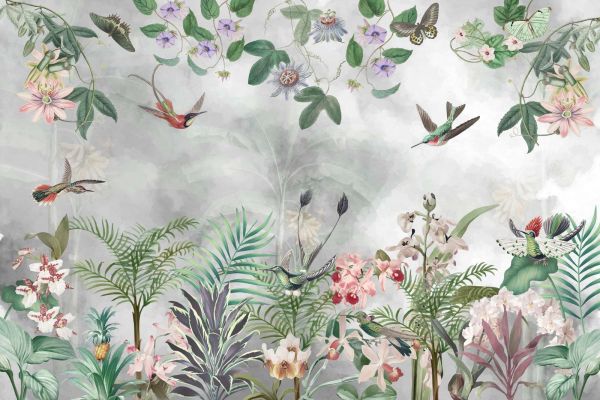 Ce design capture l’essence d’un paradis tropical, où beauté naturelle et sérénité se rejoignent. Des fleurs exotiques telles que des orchidées et des fruits de la passion fleurissent au milieu de palmiers luxuriants et de diverses feuilles vertes. Les colibris flottent gracieusement dans les airs, entourés de papillons subtils qui dansent délicatement parmi les fleurs. La palette de couleurs, composée de tons pastel doux et d'accents vifs, souligne à la fois une atmosphère fraîche et détendue.