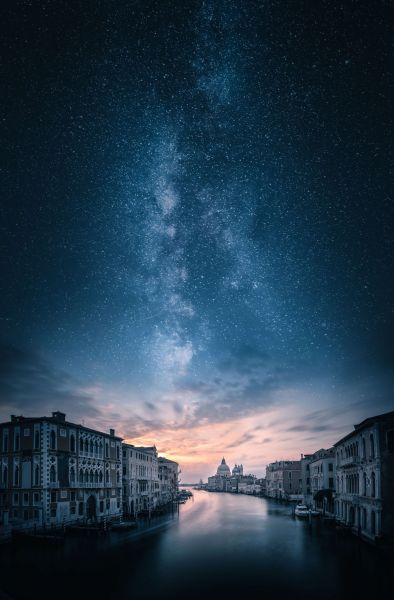 Image artistique du grand canal et de la basilique de Santa Maria della Salute à Venise. Au loin, le ciel est encore légèrement coloré.