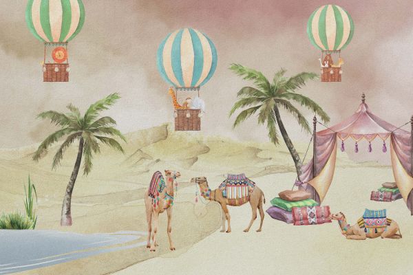 Trois montgolfières remplis d'adorables voyageurs du monde passent au-dessus du désert.